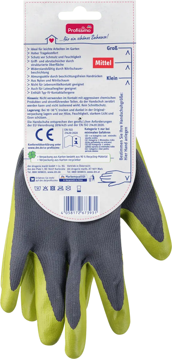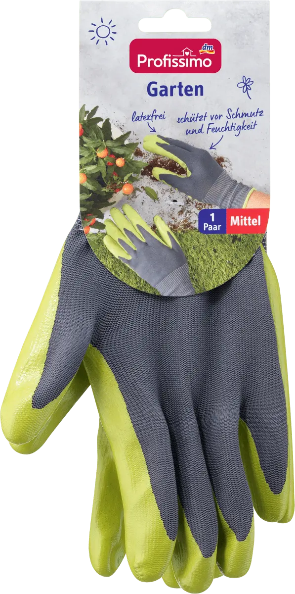 Садовые перчатки Profissimo идеально подходят для легких работ в саду. Они впечатляют высоким уровнем комфорта, защищают от грязи и влаги, не скользят и не скользят. Покрытие из нитриловой пены делает их очень прочными, а тыльная сторона руки без покрытия делает их дышащими. Подходит для людей, страдающих аллергией на латекс. Содержит контактные аллергены IV типа.