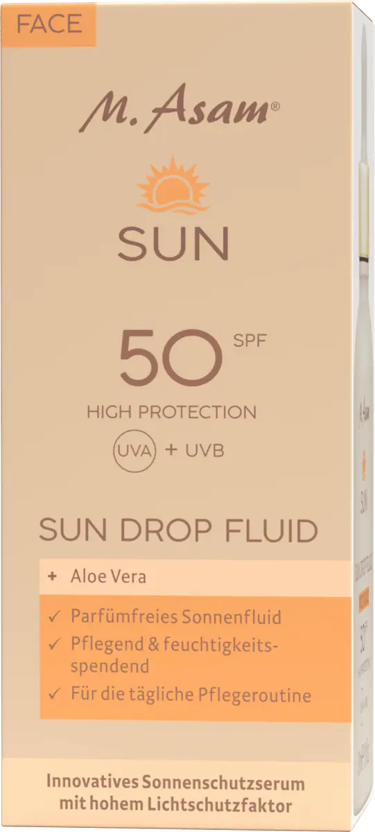Флюид Sun Drop с SPF 50 от M.Asam идеален в качестве защиты от солнца для лица, шеи и декольте. Защита от солнца содержит гиалуроновую кислоту, алоэ вера, пантенол. Витамин Е и кокосовая вода защищают от лучей UVA и UVB. Сыворотка также обеспечивает интенсивное увлажнение и защиту кожи на целый день на солнце.