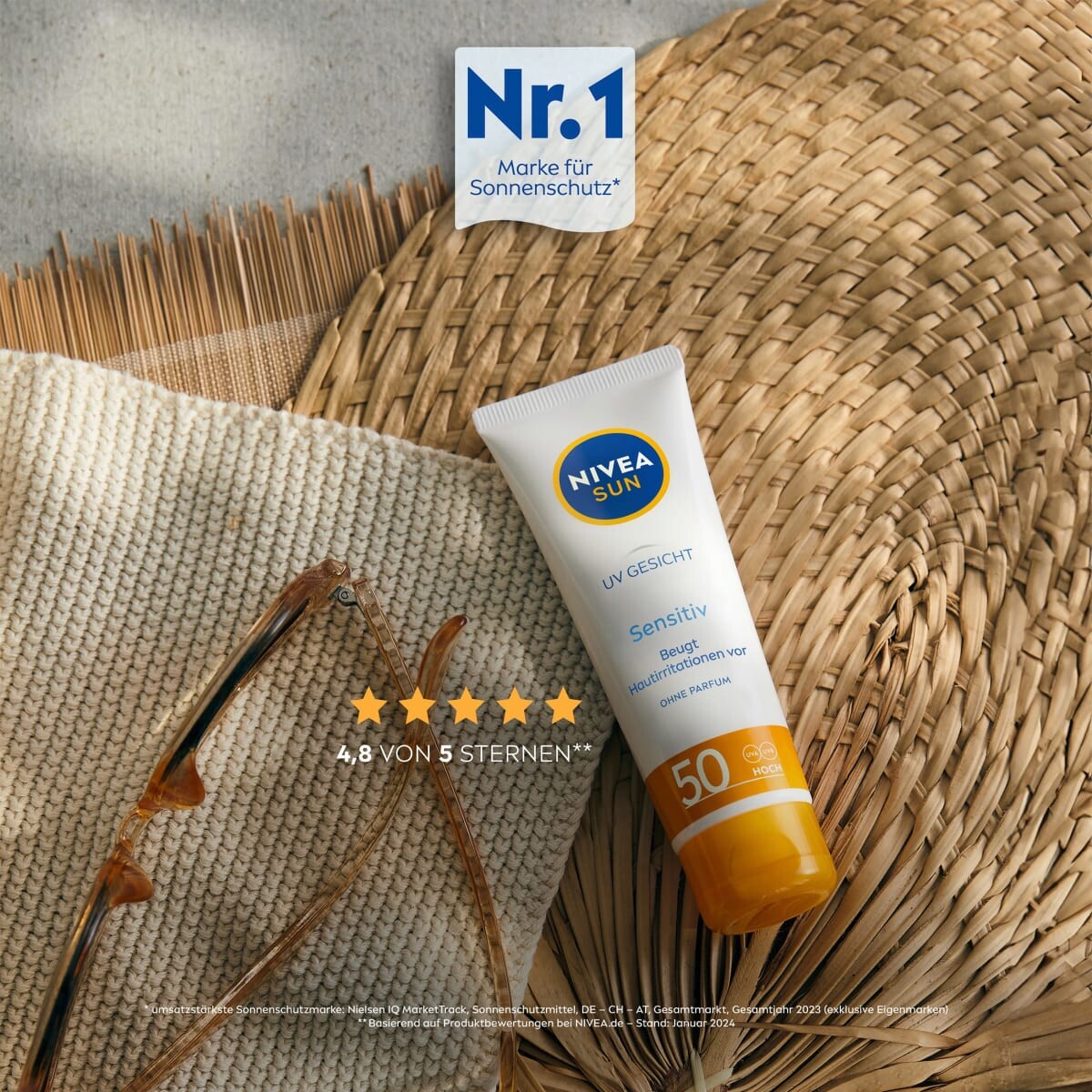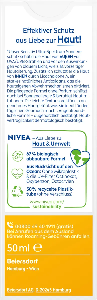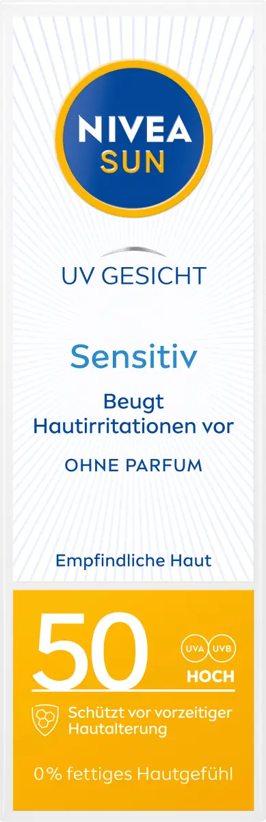 УФ-излучение чувствительная защита от солнца от NIVEA SUN идеальна в качестве защиты для чувствительной и чувствительной кожи. Солнцезащитный крем содержит солнцезащитный фактор 50 и может наноситься на лицо, шею и зону декольте. Он обеспечивает эффективную защиту от UVA и UVB-излучения и легко наносится благодаря легкой текстуре. Питательная защита от солнца также защищает от раздражения кожи и солнечной аллергии.