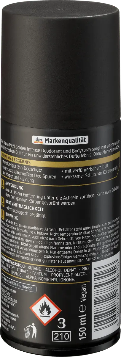 Дезодорант и спрей для тела Balea MEN Golden Intense дарит неотразимое ощущение пряного, пряного аромата. соблазнительный аромат. Он обеспечивает 24-часовую защиту от запаха тела и не оставляет белых следов дезодоранта. Рецептура без микропластика и водорастворимых, чисто синтетические полимеры.