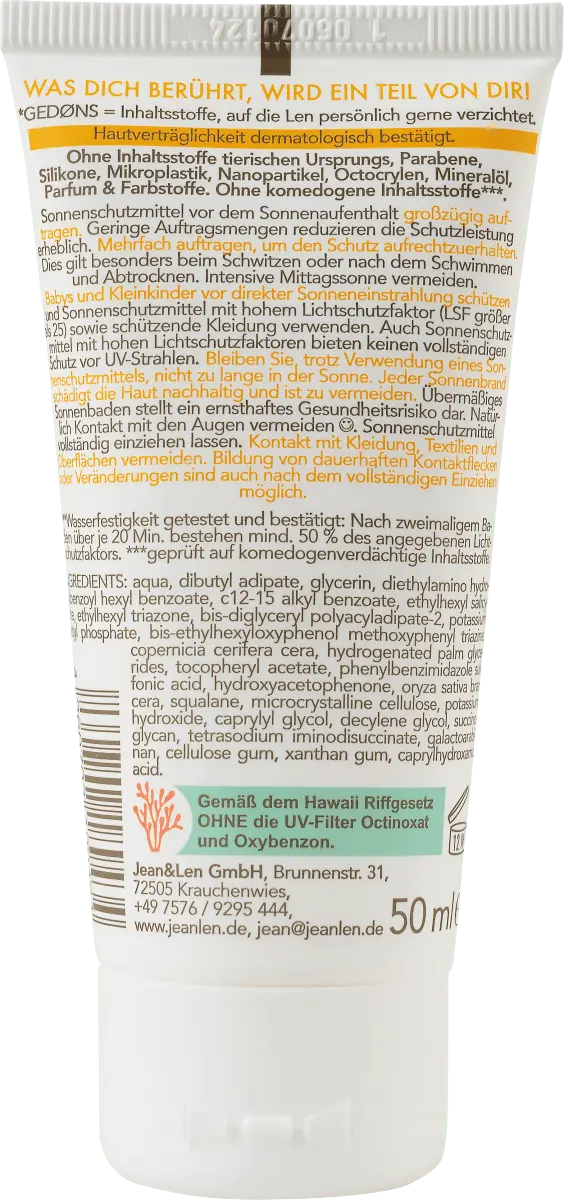 The Jean&Len Sensitive Крем солнцезащитный Лицо с SPF 50+ надежно защищает кожу лица от солнечных ожогов и при регулярном использовании предотвращает преждевременное старение кожи. Эта формулировка соответствует Закону о Гавайских рифах. Содержит сбалансированную комбинацию фильтров UVA + UVB и ценный витамин Е. Солнцезащитный крем водостойкий и подходит даже для чувствительной кожи.