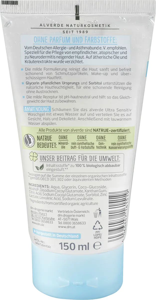 Мягкая формула Ultra Sensitive Гель для умывания от натуральной косметики Alverde pH-нейтрален для кожи и, таким образом, помогает поддерживать баланс кожи. Мягкая формула нежно очищает кожу и бережно удаляет частицы грязи, макияж и излишки кожного сала. Подходит также для кожи, склонной к нейродермитам. Эфирные масла и экстракты трав не использовались. Рецепт без микропластика и водорастворимых, чисто синтетических полимеров.