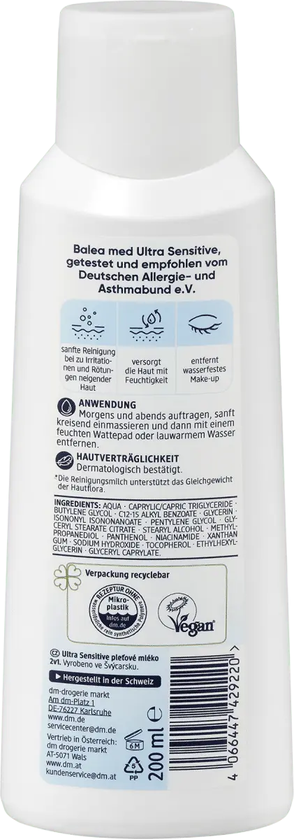 Очищающее молочко Balea MED Ultra Sensitive мягко удаляет частицы грязи и макияж с кожи. Также подходит для области вокруг глаз и водостойкого макияжа. Питательная формула предотвращает пересыхание и поддерживает баланс флоры кожи. Протестировано и рекомендовано Немецкой ассоциацией аллергиков и астматиков. Рецепт без микропластика и водорастворимых, чисто синтетических полимеров. Продукт соответствует Руководству по чистоте красоты Balea - www.dm.de/balea