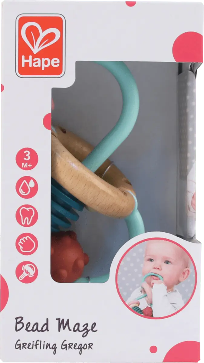 Игрушка-захват Грегора от Hape имеет Имеет форму знака бесконечности и изготовлен из силикона и дерева. Он оснащен элементами из разных фактур, таких как дерево, пластик и резина, которые по желанию можно проталкивать через лежащую восьмерку.