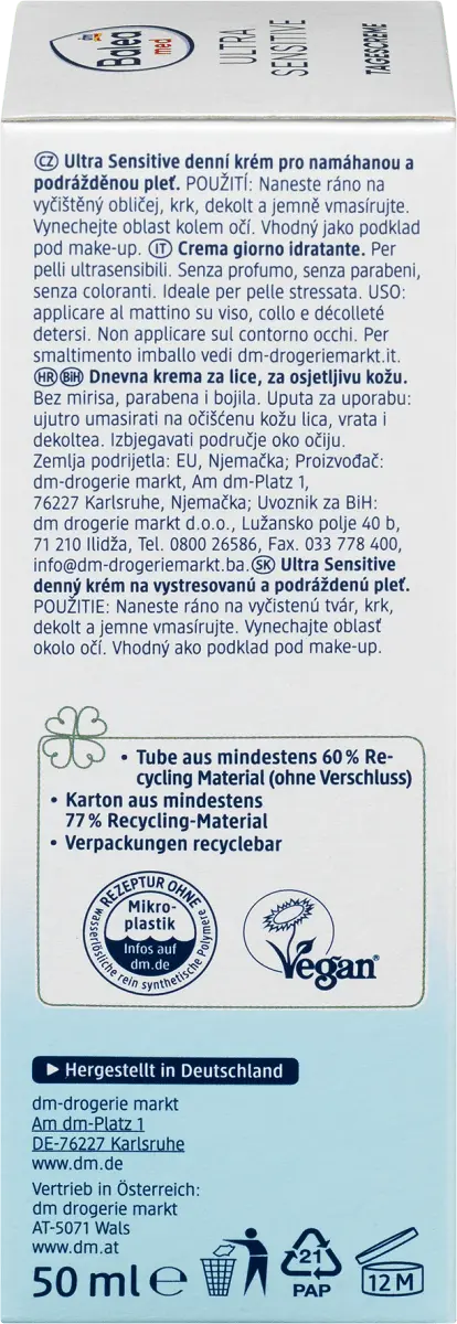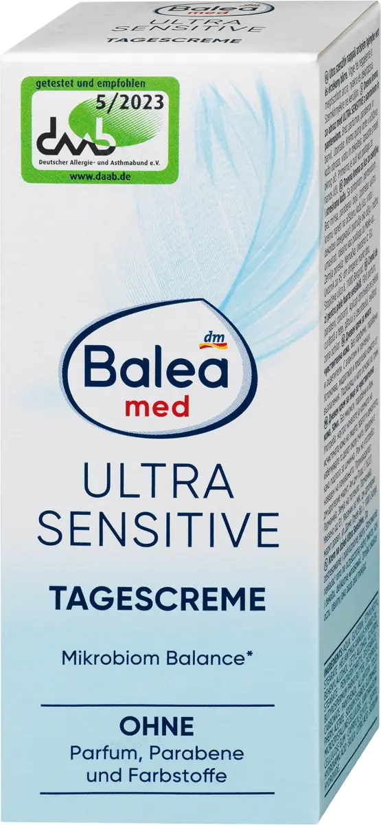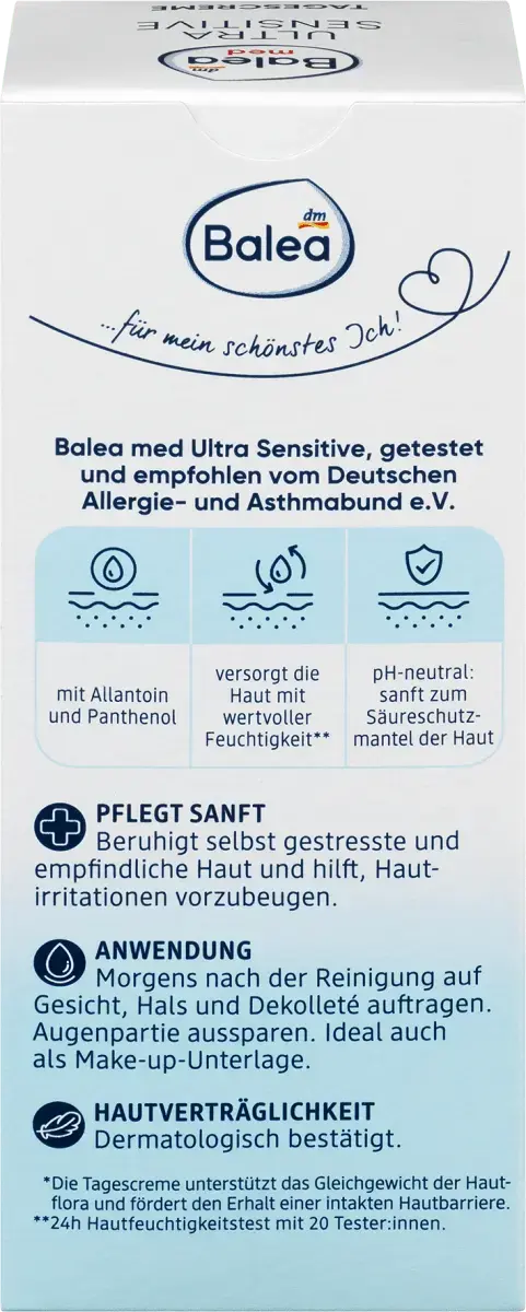 The Balea MED Ultra Sensitive day крем с аллантоином и пантенолом снабжает кожу ценной влагой. Он нежно воздействует на защитную кислотную мантию кожи, успокаивает даже подверженную стрессу и чувствительную кожу и помогает предотвратить раздражение кожи. Переносимость кожей проверена дерматологами. Протестировано и рекомендовано Немецкой ассоциацией аллергиков и астматиков. Рецепт без микропластика и водорастворимых, чисто синтетических полимеров. Продукт соответствует Руководству по чистой красоте Balea - www.dm.de/balea