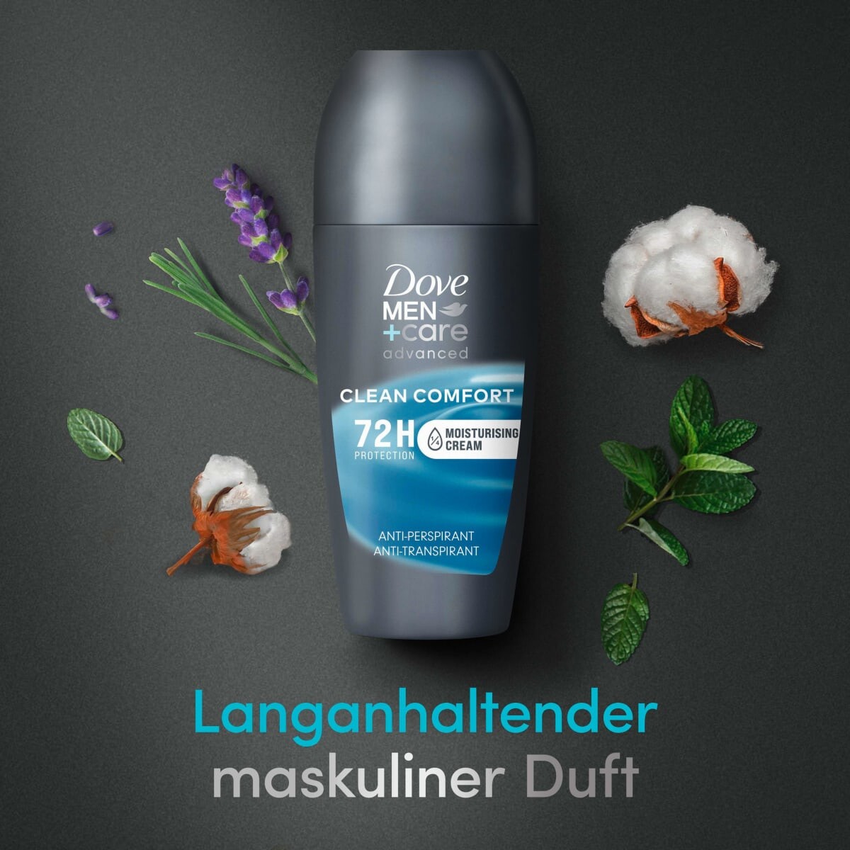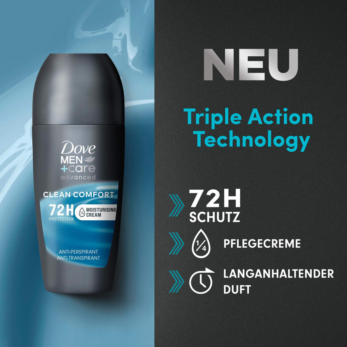 Роликовый дезодорант-антиперспирант Dove Men+Care Advanced Clean Comfort защищает от пота и запаха тела на срок до 72 часов. Крем-антиперспирант с ¼ ухода защищает кожу от раздражения, борется с потом и нежно воздействует на кожу. Дезодорант также балует мужчин чистым, тонким, мужественным ароматом.