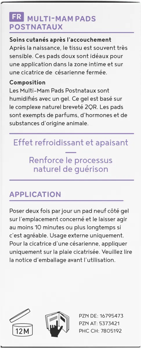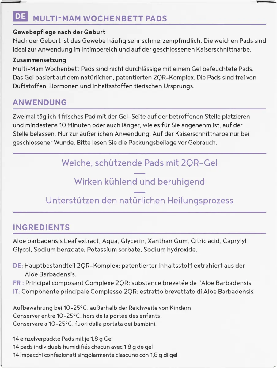 Подушечки MULTI-MAM для ухода за тканями после родов идеально подходят для использования в интимной зоне и на шраме от кесарева сечения. Они оказывают охлаждающее и успокаивающее действие и поддерживают естественный процесс заживления с помощью биоактивного, запатентованного активного комплекса 2QR.