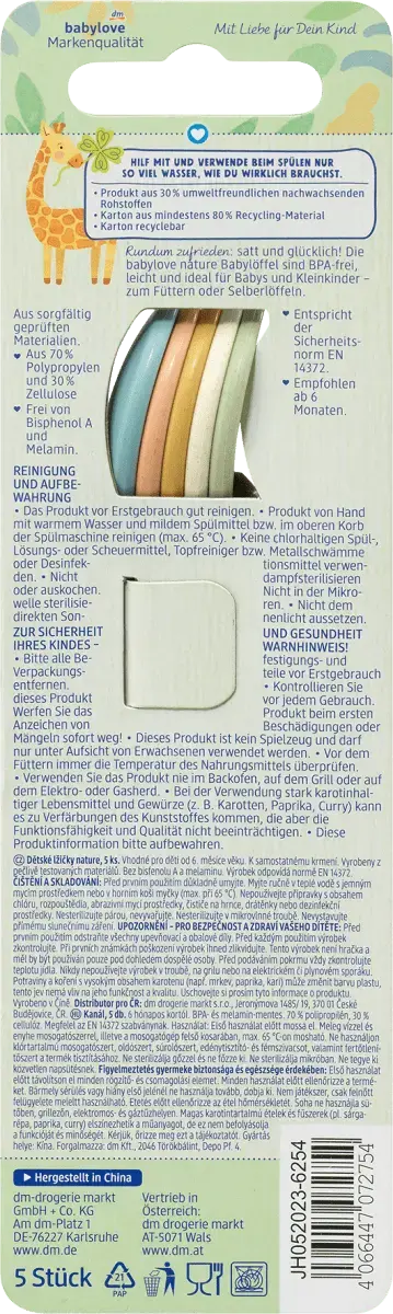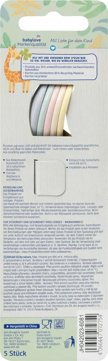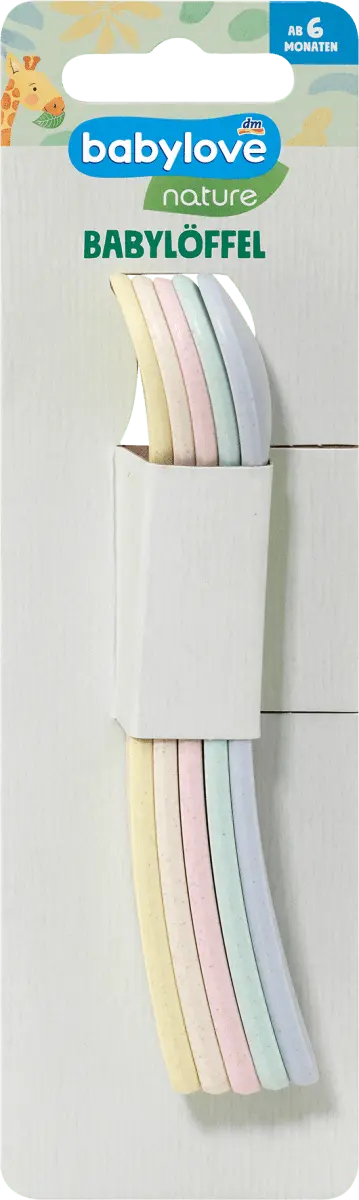Детские ложки babylove Nature в упаковке по 5 штук не содержат бисфенола-А, легкие и идеально подходят для младенцев и малышей — их можно кормить или брать самостоятельно. Они также изготовлены из тщательно проверенных материалов. *Упаковка содержит не менее 70% переработанных материалов.