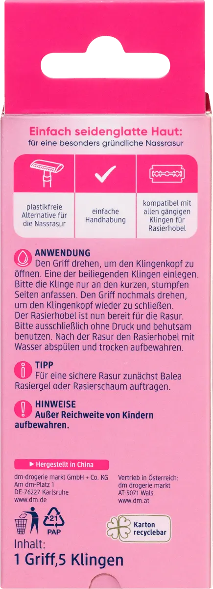 Безопасная бритва Purity от Balea обеспечивает нежное и чистое бритье. Элегантная высококачественная ручка удобно лежит в руке и обеспечивает простоту обращения. Помимо ручки, в комплект также входят пять лезвий и предлагается альтернатива влажному бритью без использования пластика. Ручка совместима со всеми распространенными лезвиями для безопасной бритвы.