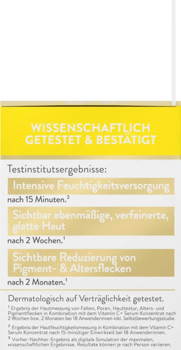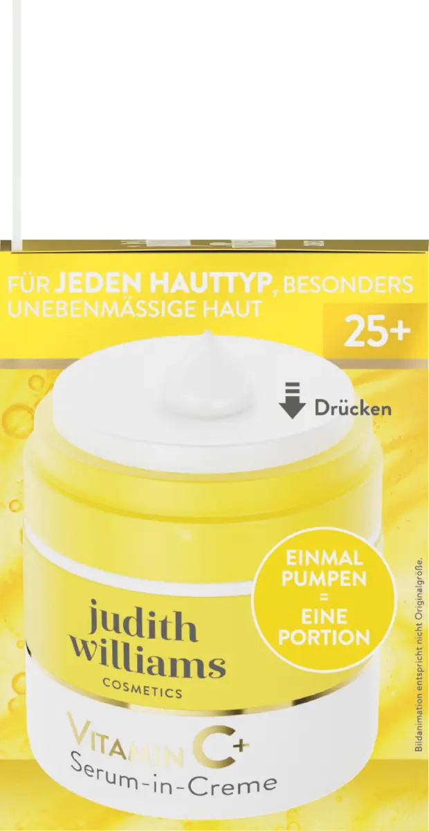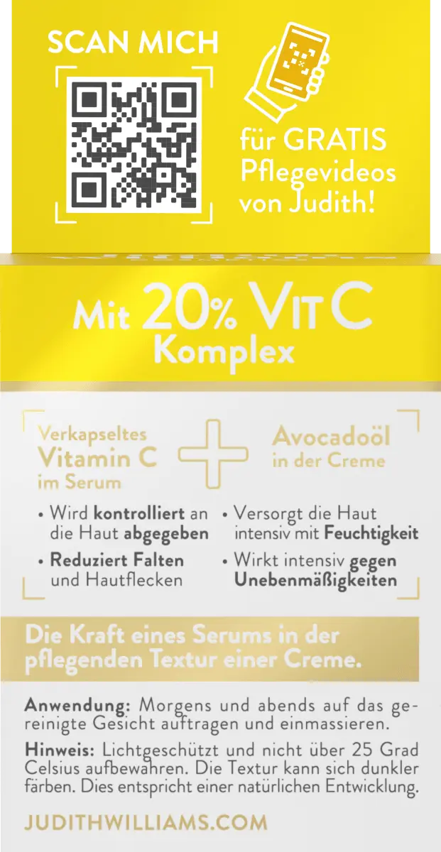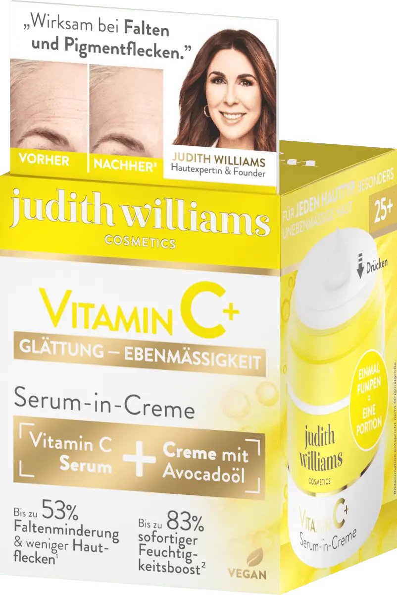 Сыворотка-в-креме Judith Williams с витамином С плюс сочетает в себе силу сыворотки с питательной текстурой крема. Он обеспечивает заметно более ровную, утонченную и гладкую кожу, а также сокращение морщин и пятен на коже до 53% всего за 14 дней. Обеспечивает видимое уменьшение пигментных и возрастных пятен уже через 2 месяца. Совместимость прошла дерматологические испытания.