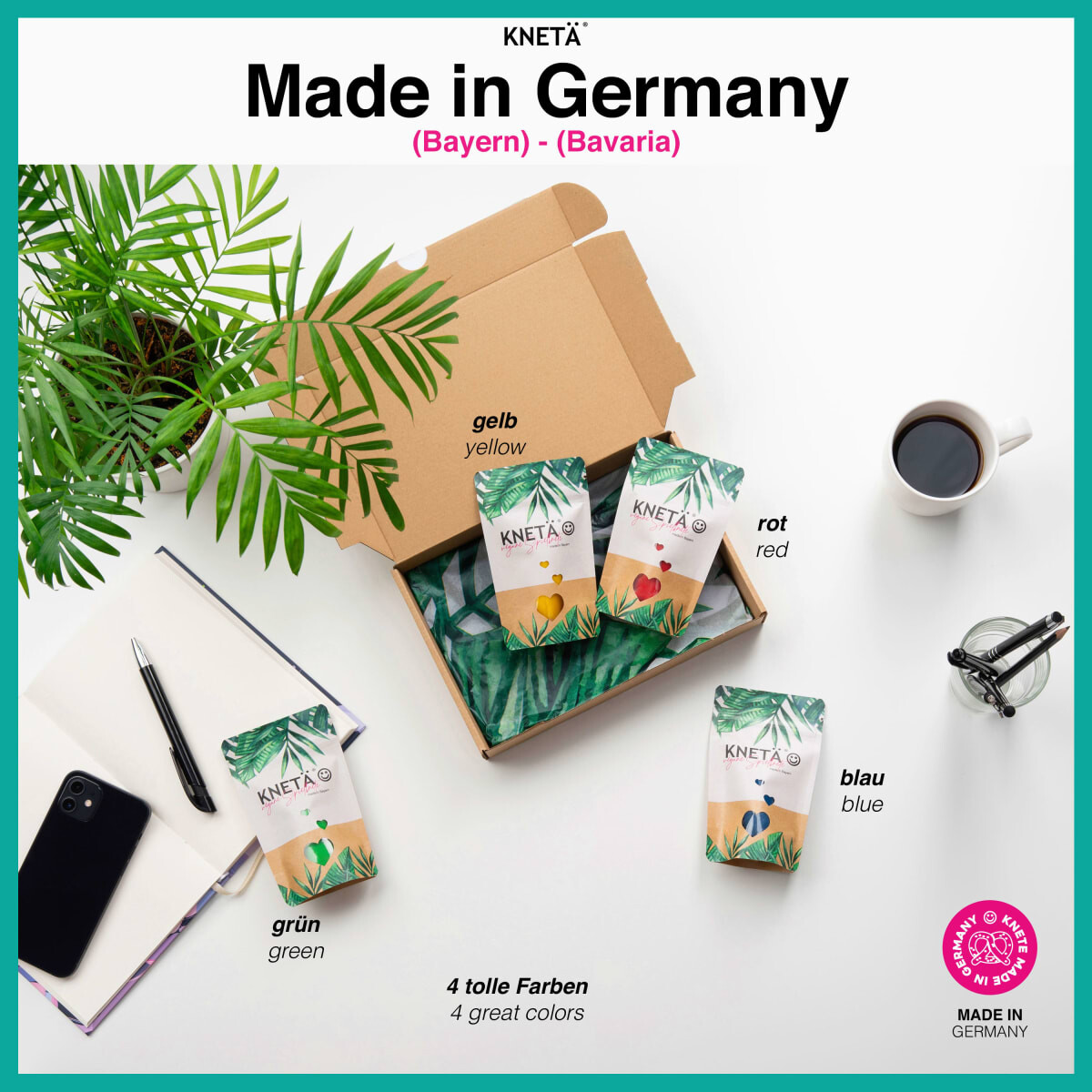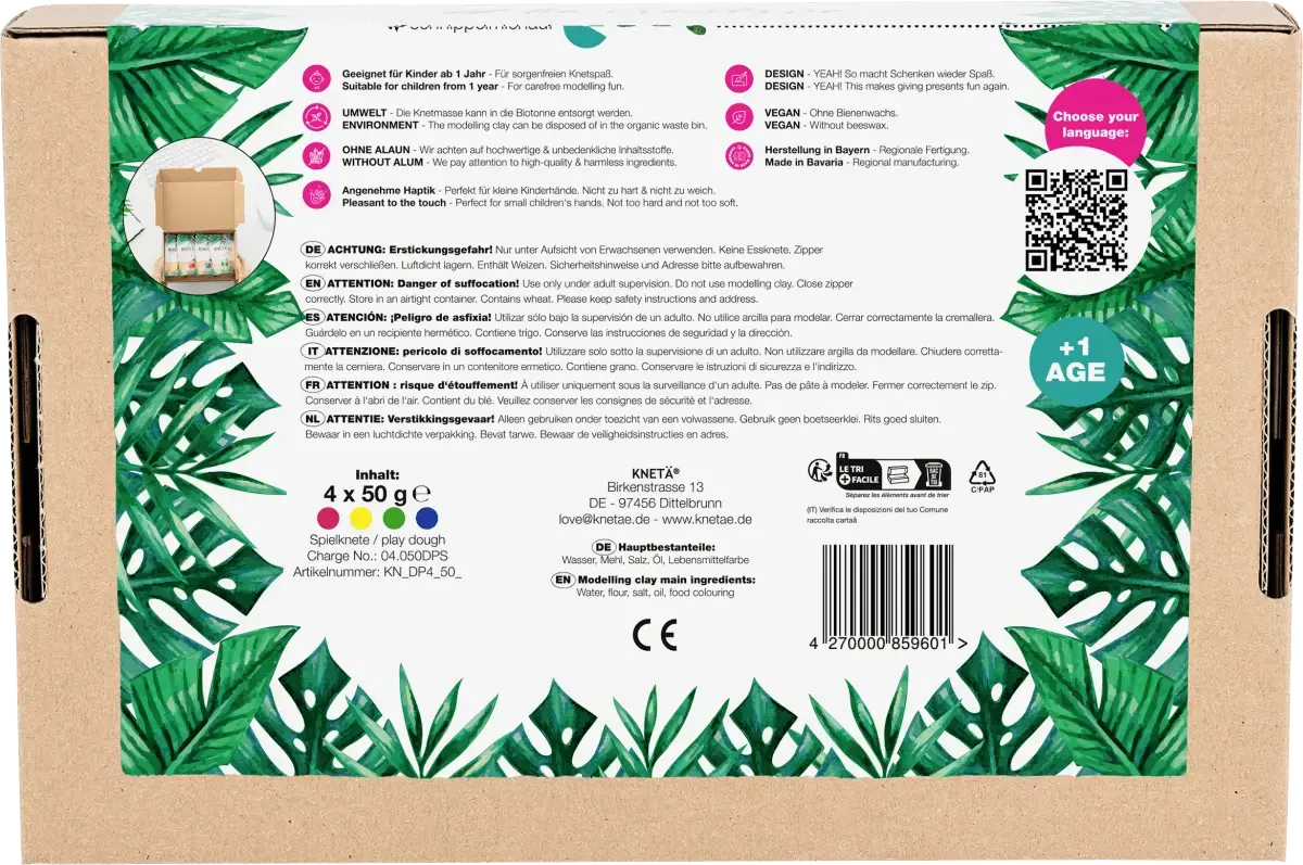 Веганское тесто в пакетиках из 4 штук от KNETÄ подходит для детей от 1 года. В комплект входят 4 великолепных цвета по 50 г каждый, так что ваш ребенок сможет весело провести время с красным, синим, желтым и зеленым и дать волю своему воображению. Тесто также было проверено независимым испытательным институтом.