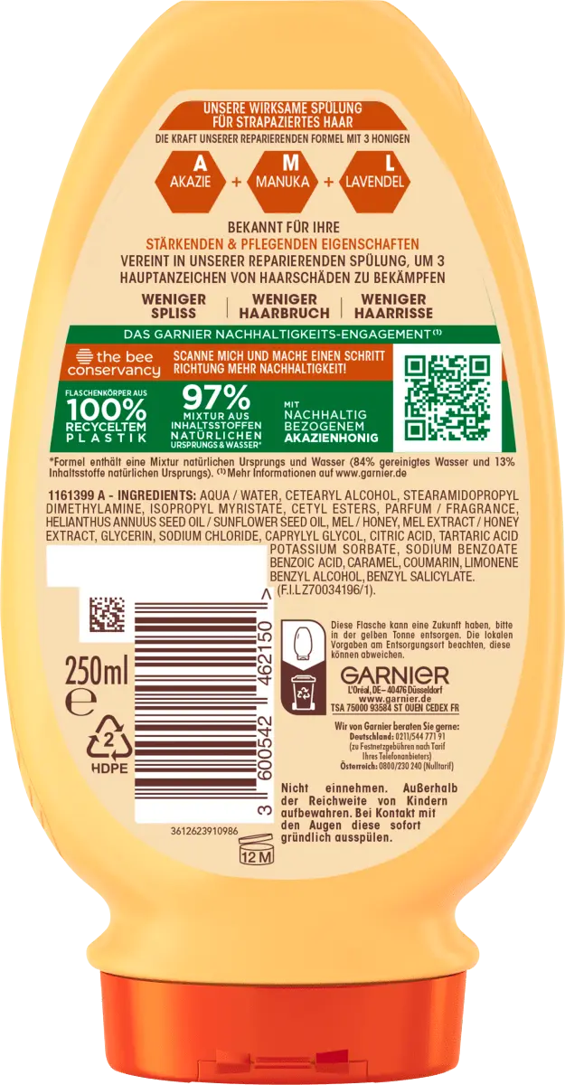 Восстанавливающий кондиционер Garnier True Treasures Honey Treasures объединила силу сокровищ улья для восстановления поврежденных волос. И восстанавливающий мед акации, и защитный пчелиный воск производятся из экологически чистых источников. Восстановленные и укрепленные до самых кончиков волосы становятся заметно эластичными, распутываются и легко расчесываются. Бонус: чудесный медовый аромат.