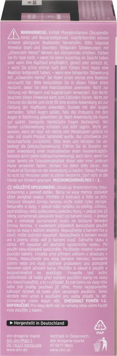 ВНИМАНИЕ: Содержит фенилендиамины (толуилендиамины) и перекись водорода. Краски для волос могут вызвать серьезные аллергические реакции. Пожалуйста, прочтите и соблюдайте следующую информацию: Временные татуировки «черной хной» могут увеличить риск аллергии. Не красите волосы: - если у вас сыпь на лице или если кожа головы чувствительна, раздражена или травмирована; - если у вас когда-либо возникала реакция после окрашивания волос; - если временная татуировка «черной хной» уже вызвала у вас реакцию. В этих случаях перед использованием краски для волос проконсультируйтесь с дерматологом. Не используйте для окрашивания ресниц и бровей. Игнорирование этого совета может привести к слепоте. Не используйте для окрашивания бороды или для каких-либо других целей, кроме окрашивания волос на голове. Избегать зрительного контакта. Немедленно промойте глаза при попадании продукта в глаза. После использования хорошо промойте волосы. Наденьте подходящие перчатки (входят в комплект). Защищать от яркого света и хранить в прохладном месте. Не используйте, если ваши волосы окрашены хной или солями металлов или обработаны продуктом, который постепенно возвращает цвет волос к естественному цвету. Обязательно прочитайте и следуйте инструкциям по использованию. Проводите тест на переносимость кожей (см. инструкцию по применению) за 48 часов до каждого использования краски для волос, даже если вы ранее использовали красящее средство той или иной марки. Поэтому не забудьте приобрести продукт за 48 часов до использования. Этот продукт не предназначен для использования лицами младше 16 лет. Храните в недоступном для детей месте. Пропорция смешивания 1: 2.