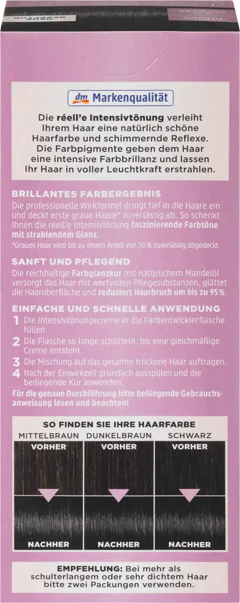 Настоящий интенсивный оттенок 2.0 черный придает волосам естественный красивый цвет и мерцающие отблески. Цветные пигменты придают волосам интенсивный цветовой блеск и позволяют вашим волосам сиять полной яркостью. Профессиональная активная формула глубоко проникает в волосы и надежно закрашивает первую седину*. Интенсивный оттенок дает вам захватывающие цвета с сияющим блеском. Средство для блеска насыщенного цвета с натуральным миндальным маслом снабжает волосы ценными ухаживающими веществами, разглаживает поверхность волос и уменьшает их ломкость до 95%. *Седые волосы надежно закрашиваются на долю 50%.