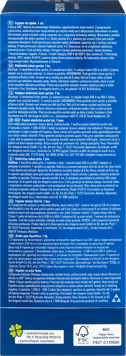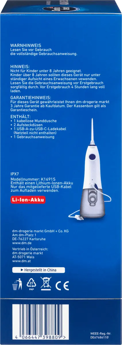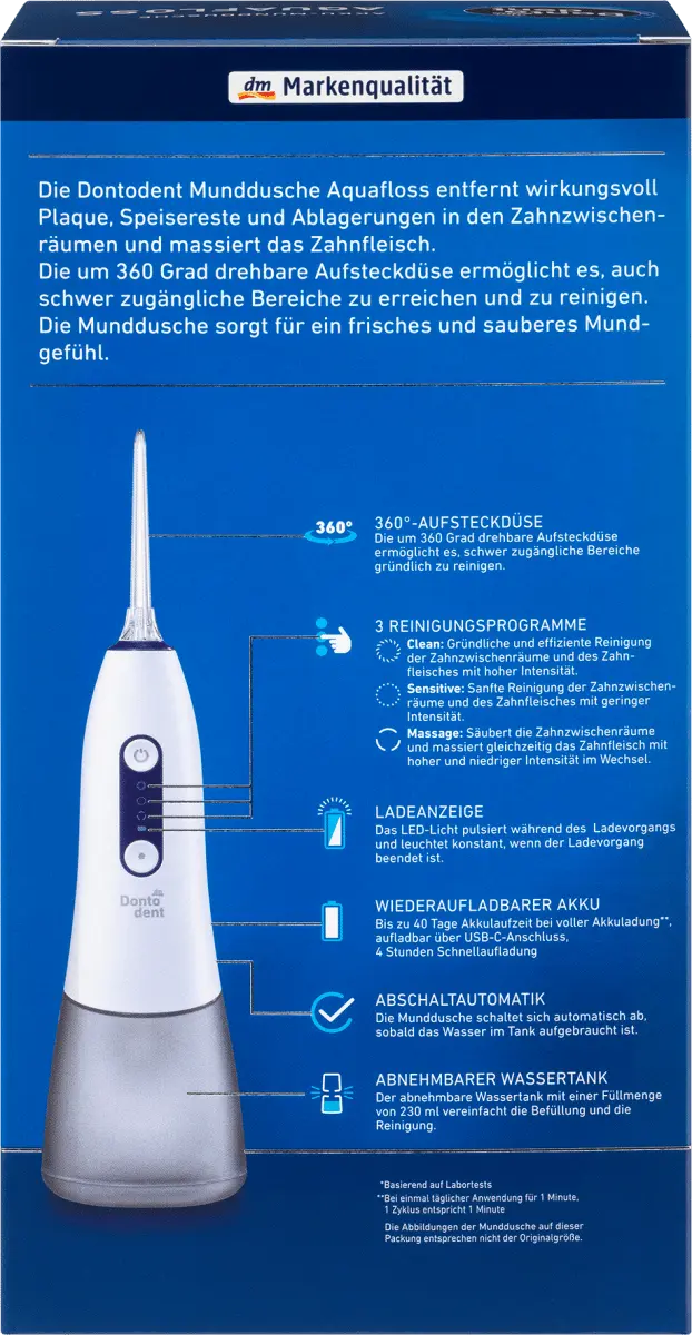 br>Аккумуляторный ирригатор для полости рта Aquafloss от Dontodent обеспечивает эффективную очистку межзубных промежутков струей воды. Налет, остатки пищи и отложения эффективно удаляются, десны массируются. Благодаря вращающейся на 360 градусов насадке можно добраться и очистить даже труднодоступные места. Ирригатор полости рта имеет три программы очистки и автоматическое отключение.