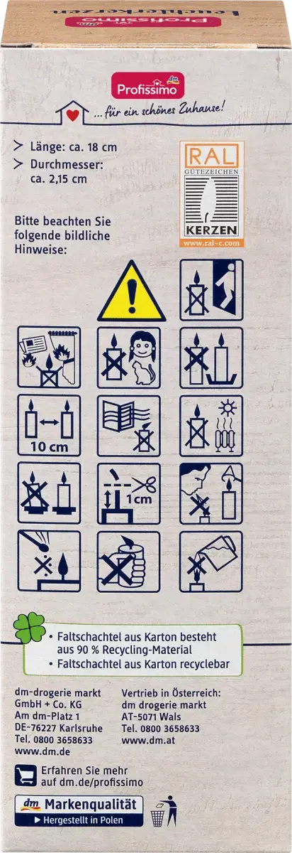Всегда помещайте свечи в не легковоспламеняющийся подсвечник. Не перемещайте и не держите под углом во время горения. Поставьте горящие свечи на расстоянии не менее 10 см друг от друга. Не оставляйте горение без присмотра. Беречь от детей и животных. Берегите от сквозняков. Если пламя слишком высокое, укоротите фитиль. Обратите внимание на символы на упаковке.