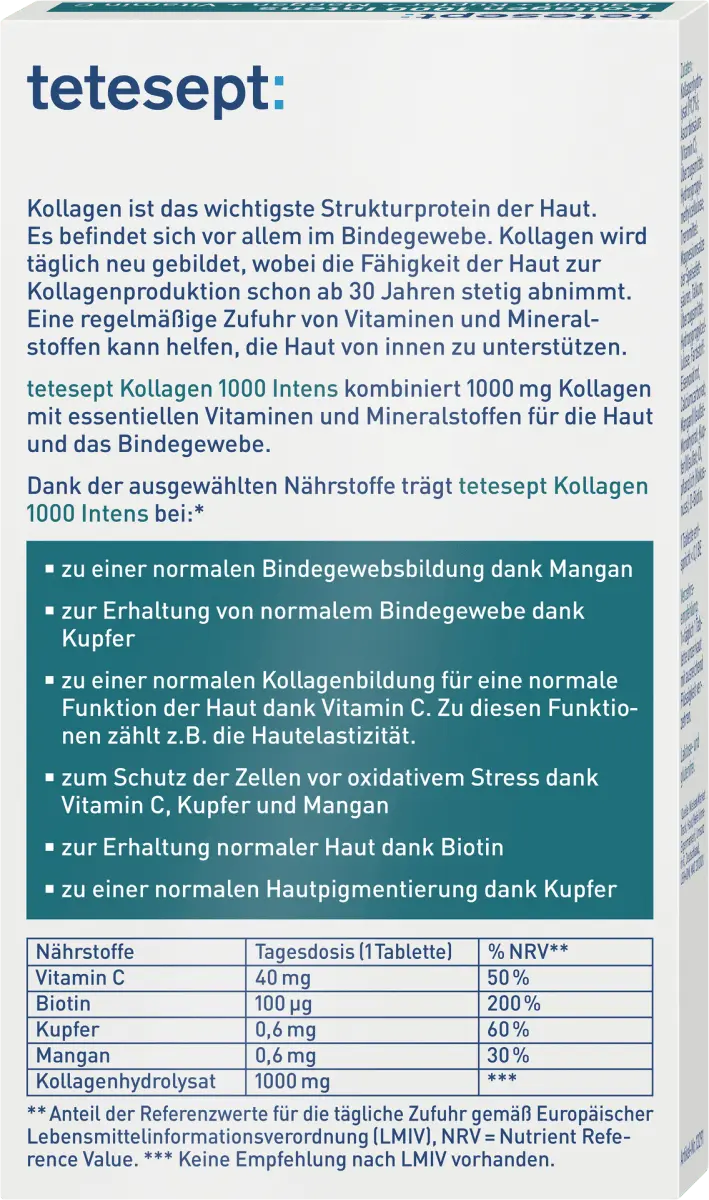 tetesept Collagen 1000 Intens сочетает в себе 1000 мг коллагена с необходимыми витаминами и минералами для кожи и соединительной ткани. Благодаря выбранным питательным веществам тетесепт Коллаген 1000 Интенс способствует: нормальному образованию соединительной ткани благодаря марганцу, поддержанию нормальной соединительной ткани благодаря меди, нормальному образованию коллагена для нормального функционирования кожи благодаря витамину С, защите клеток от окислительного воздействия. стресса благодаря витамину С, меди и марганцу, для поддержания нормальной кожи благодаря биотину и для нормальной пигментации кожи благодаря меди.