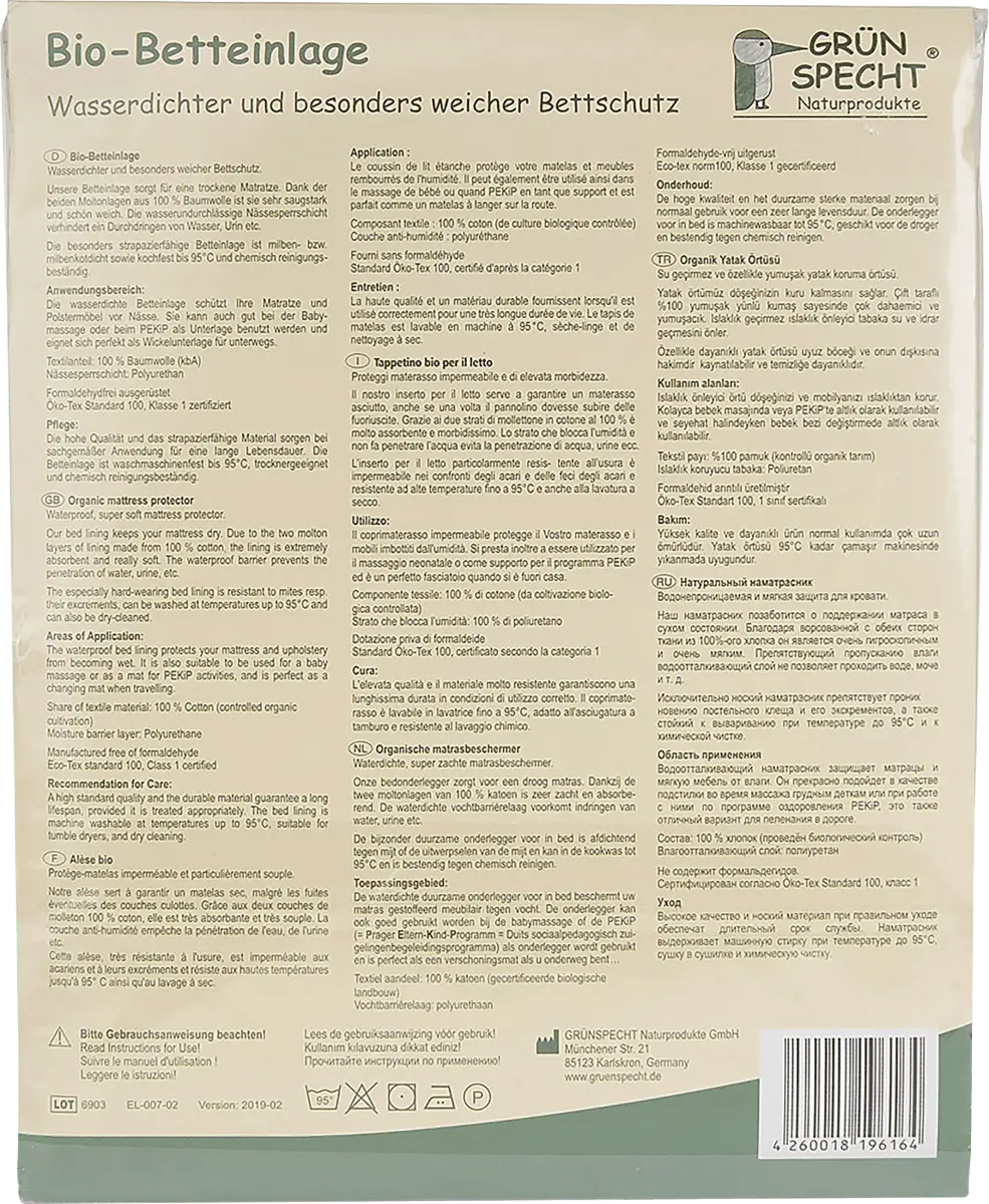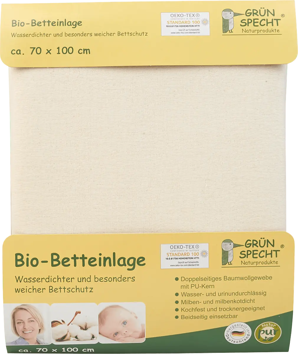 Органический Вставка для кровати от Grünpecht размером примерно 70 x 100 см обеспечивает водонепроницаемую и особенно мягкую защиту кровати. Материал изготовлен из двусторонней хлопчатобумажной ткани с полиуретановой сердцевиной, поэтому вставка очень впитывающая и приятная на ощупь. Водонепроницаемый влагозащитный слой предотвращает проникновение воды и мочи. Кроме того, прочный вкладыш для кровати защищен от клещей и экскрементов клещей, а также может использоваться в качестве покрытия для пеленального столика.