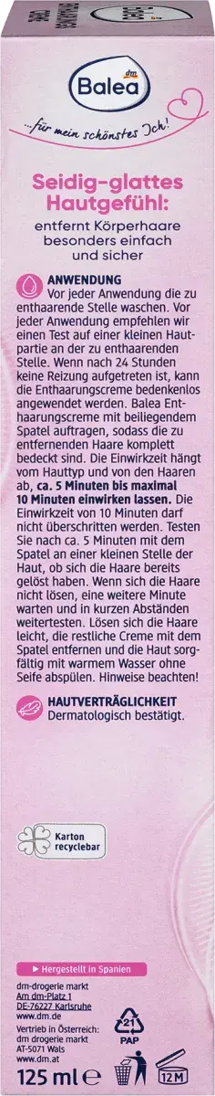 Перед использованием вымойте участок, подлежащий депиляции. Перед каждым использованием мы рекомендуем провести тест на небольшом участке кожи на участке, подлежащем депиляции. Если в течение 24 часов раздражения не возникло, крем для депиляции можно смело использовать. Нанесите крем для депиляции Balea с помощью прилагаемой лопаточки так, чтобы волосы, подлежащие удалению, были полностью покрыты. Время воздействия зависит от типа кожи и волос, оставьте на время от 5 до 10 минут. Время воздействия 10 минут превышать нельзя. Примерно через 5 минут с помощью лопаточки проверьте небольшой участок кожи, чтобы убедиться, что волосы уже оторвались. Если волосы не отрываются, подождите еще минуту и продолжайте тестирование через короткие промежутки времени. Если волосы слегка расшатываются, удалите остатки крема лопаточкой и тщательно промойте кожу теплой водой без мыла. Обратите внимание на инструкции.