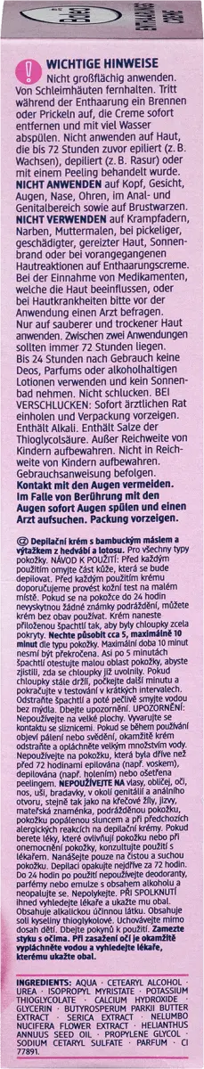 Не использовать на больших площадях. Беречь от слизистых оболочек. Если во время эпиляции возникло ощущение жжения или покалывания, немедленно удалите крем и промойте большим количеством воды. Не используйте на коже, которая подвергалась эпиляции (например, воском), депиляции (например, бритьем) или коже, обработанной пилингом не позднее 72 часов назад. НЕ ИСПОЛЬЗУЙТЕ на голове, лице, глазах, носу, ушах, анальной и генитальной областях, а также на сосках. НЕ ИСПОЛЬЗУЙТЕ при варикозном расширении вен, шрамах, родинках, пятнистой, поврежденной, раздраженной коже, солнечных ожогах или предыдущих кожных реакциях на крем для удаления волос. Если вы принимаете лекарства, влияющие на кожу или страдаете кожными заболеваниями, перед применением проконсультируйтесь с врачом. Используйте только на чистую и сухую кожу. Между двумя применениями всегда должно быть не менее 72 часов. Не используйте дезодоранты, духи или лосьоны, содержащие спирт, и не загорайте в течение 24 часов после использования. Не глотай. ПРИ ПРОГЛАТЫВАНИИ: Немедленно обратитесь к врачу и покажите контейнер. Содержит щелочь, содержит соли тиогликолевой кислоты. Храните в недоступном для детей месте. Храните в недоступном для детей месте. Следуйте инструкциям по использованию. Избегать зрительного контакта. При попадании в глаза немедленно промыть глаза и обратиться за медицинской помощью. Показать упаковку.