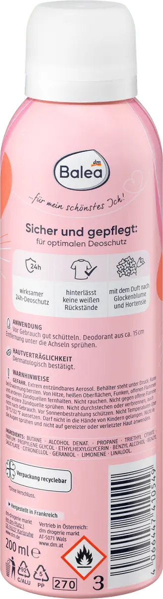 Дезодорант Soft Flower от Balea обеспечивает надежную защиту в течение всего дня а также обеспечивает дополнительные преимущества – ощущение ухоженной и свежей кожи. Дезодорант-спрей также придает чарующий аромат колокольчика и гортензии, что придает дополнительное ощущение свежести. Рецептура без микропластика и водорастворимых, чисто синтетических полимеров.