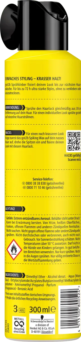 Описание продукта Легкая укладка — отличная фиксация Алюминиевая банка, пригодная для вторичной переработки (см. местные инструкции по переработке) Сохраняет внешний вид до следующего мытья головы. Веганский (без ингредиентов животного происхождения) Клей-спрей для лака для волос от got2b обеспечивает ультрастойкий внешний вид и надежную фиксацию. Он фиксирует ваш внешний вид до следующего мытья головы — до 72 часов сверхстойкой укладки без прилипания и высыхания. Номер товара в dm: 137154 Предупреждения Опасность. Чрезвычайно легковоспламеняющийся аэрозоль. Контейнер находится под давлением: при нагревании может лопнуть. Хранить вдали от источников тепла, горячих поверхностей, искр, открытого огня и других источников возгорания. Не курить. Не распыляйте на открытое пламя или другой источник возгорания. Не прокалывайте и не сжигайте даже после использования. Защищайте от солнечных лучей. Не подвергать воздействию температур выше 50°C. Храните в недоступном для детей месте. Используйте в хорошо вентилируемых помещениях. Кратковременно распылите. Не распыляйте в глаза. Сдавайте только совершенно пустую банку для переработки. Ингредиенты Состав: диметиловый эфир, денатурированный спирт, вода (вода, вода), сополимер октилакриламида/акрилата/бутиламиноэтилметакрилата, аминометилпропанол, отдушка (ароматизатор). ), Бензойная кислота Как применять Равномерно распылите лак на волосы с расстояния 30 см. Для индивидуального образа распылите распылитель специально на отдельные пряди волос. Инструкция по хранению > Защищать от солнечного света. Не подвергать воздействию температур выше 50°C. Следует хранить в недоступном для детей месте.