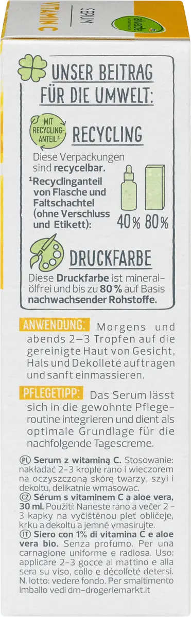 Помимо энергетического витамина С, сыворотка с витамином С от Alverde NATURKOSMETIK также содержит органическое алоэ вера, экстракт горького апельсина и виноградную воду и обеспечивает ежедневную порцию естественного сияния. Благодаря антиоксидантным свойствам витамина С кожа защищена от воздействия окружающей среды, а появление тонких линий и морщин может быть уменьшено. Приятная легкая формула с 1% витамина С способствует выравниванию цвета лица и делает кожу гладкой. Рецепт без микропластика и водорастворимых, чисто синтетических полимеров.
