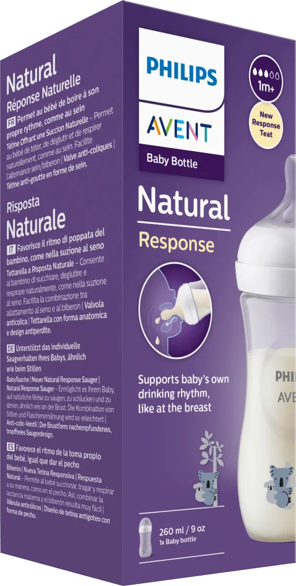 Детская бутылочка Philips AVENT Natural Response в дизайне Koala вмещает 260 мл и оснащена специальной соской Natural Response. Молоко выделяется только тогда, когда ребенок активно пьет. Это позволяет ребенку сосать, глотать и дышать в своем естественном ритме, аналогичном грудному вскармливанию. Это позволяет легко совмещать грудное вскармливание и кормление из бутылочки.