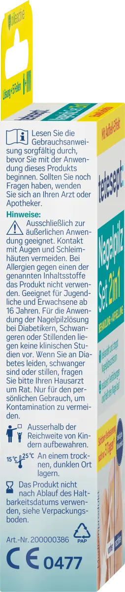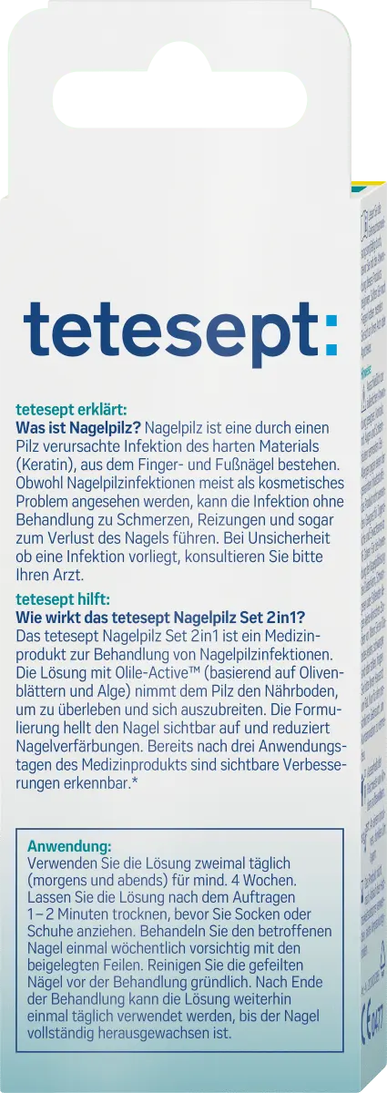 Набор tetesept от грибка ногтей 2 дюйма -1 – медицинский препарат для лечения грибковых инфекций ногтей. Раствор с Olile-Active (на основе оливковых листьев и водорослей) лишает грибок питательной среды для выживания и распространения. Формула заметно осветляет ноготь и уменьшает обесцвечивание ногтей. Видимые улучшения можно увидеть уже через три дня применения медицинского изделия.
