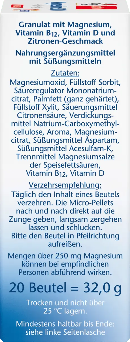 Точное название продукта: Гранулы с магнием, витамином B12, витамином D и вкусом лимона. Пищевая добавка с подсластителями. Состав: оксид магния, наполнитель сорбит, кислотность. регулятор мононатрий цитрат, пальмовый жир (полностью гидрогенизированный), наполнитель ксилит, подкислитель лимонная кислота, загуститель натрий карбоксиметилцеллюлоза, ароматизатор, цитрат магния, подсластитель аспартам, подсластитель ацесульфам-К, антислеживатель магниевые соли жирных кислот, цианокобаламин, холекальциферол. информация об аллергенах.
