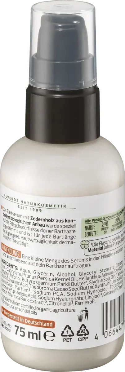 Придает бороде блеск и гибкость: сыворотка для бороды Alverde MEN Rough Nature с кедровым деревом, полученным из контролируемого органического выращивания, была специально разработана с учетом потребностей в уходе за волосами бороды. Идеально подходит для любой длины бороды. Формула с маслом ши, подсолнечника и соевого масла из сертифицированного органического сельского хозяйства, а также маслом какао и маслом персиковых косточек питает волосы бороды и кожу лица под ними. Богатая формула с растительным глицерином и гиалуроновой кислотой быстро впитывается и не оставляет жирного блеска: борода становится мягче и ухоженнее. Этот продукт не содержит микропластика и водорастворимых синтетических полимеров.