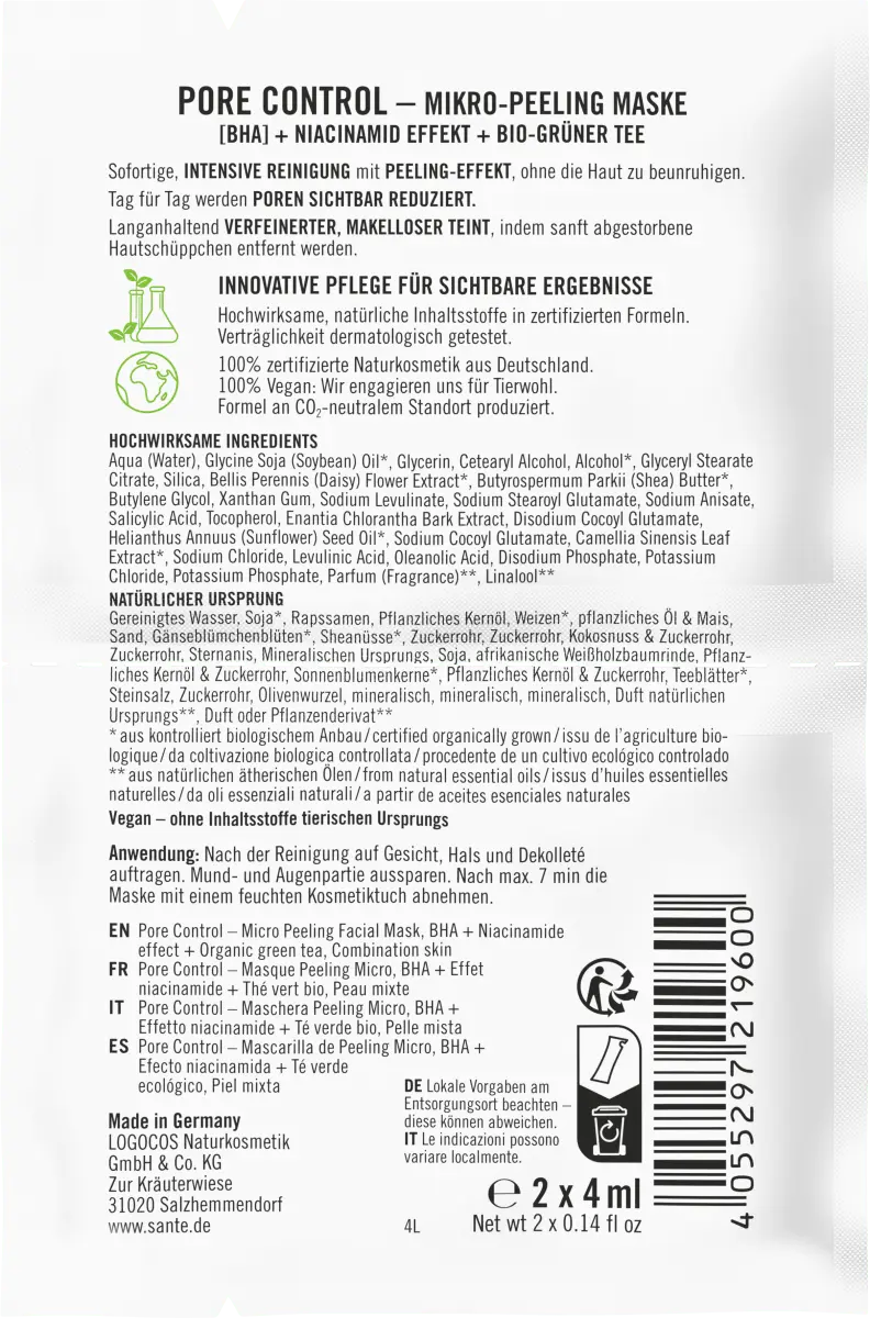 Микропилинговая маска Pore Control BHA с комплексом ниацинамида и органическим зеленым чаем от SANTE NATURKOSMETIK оказывает мягкий пилинг-эффект. Интенсивно очищает, не повреждая кожу. Для приятного ухода.