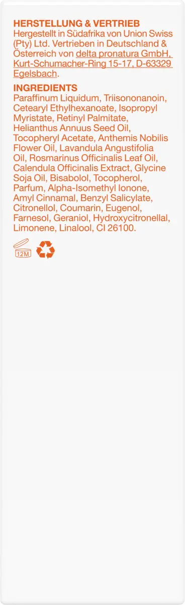 ИНГРЕДИЕНТЫ Парафин жидкий, триизононаноин, цетеарилэтилгексаноат, изопропилмиристат, ретинилпальмитат, масло семян Helianthus Annuus, токоферилацетат, цветочное масло Anthemis Nobilis, масло лаванды узколистной, розмаринус. Масло листьев лекарственного, экстракт календулы лекарственной, глициновое соевое масло, бисаболол, токоферол, отдушка, альфа-изометилионон, амилциннамал, бензилсалицилат, цитронеллол, кумарин, эвгенол, фарнезол, гераниол, гидроксицитронеллаль, лимонен, линалоол, CI 26100.