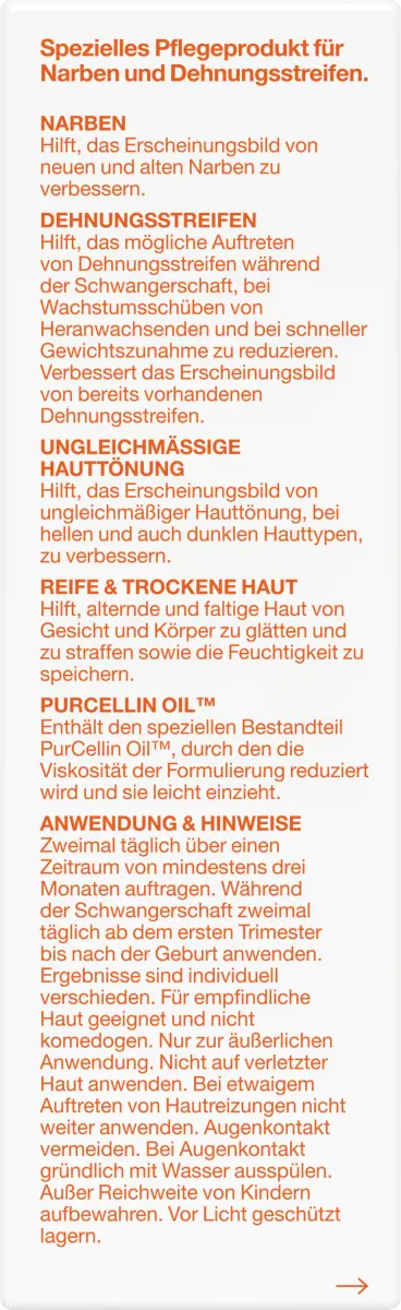 Специальное средство для ухода за шрамами и растяжками. ШРАМЫ Помогает улучшить внешний вид новых и старых шрамов. РАСТЯЖКИ Помогает уменьшить возможное появление растяжек во время беременности, скачков роста в подростковом возрасте и быстрого набора веса. Улучшает внешний вид существующих растяжек. НЕРОВНЫЙ ТОН КОЖИ Помогает улучшить неровный тон кожи как на светлой, так и на темной коже. ЗРЕЛАЯ И СУХАЯ КОЖА Разглаживает и подтягивает стареющую и морщинистую кожу лица и тела, а также сохраняет влагу. PURCELLIN Содержит специальный ингредиент PurCellin Oil, который снижает вязкость состава и облегчает его впитывание. ПРИМЕНЕНИЕ Применяйте два раза в день в течение как минимум трех месяцев. Используйте два раза в день во время беременности, начиная с первого триместра и до момента рождения. Результаты варьируются от человека к человеку. Подходит для чувствительной кожи и некомедогенен.