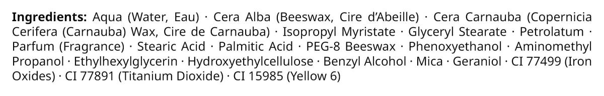 Состав: Aqua (Вода, Eau), Cera Альба (пчелиный воск, Cire d'Abeille), Cera Carnauba (воск Copernicia Cerifera (Carnauba), Cire de Carnauba), изопропилмиристат, глицерилстеарат, вазелин, отдушка (аромат), стеариновая кислота, пальмитиновая кислота, пчелиный воск ПЭГ-8, феноксиэтанол. , Аминометилпропанол, этилгексилглицерин, гидроксиэтилцеллюлоза, бензиловый спирт, слюда, гераниол, CI 77499 (оксиды железа), CI 77891 (диоксид титана), CI 15985 (желтый 6)