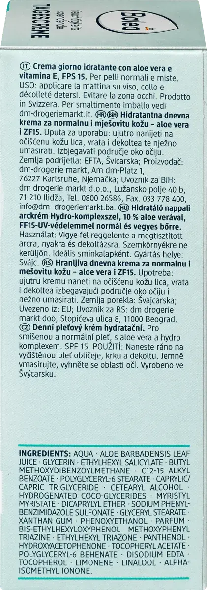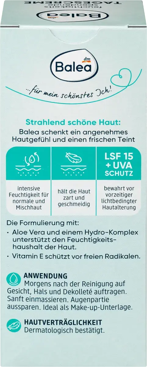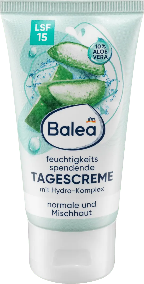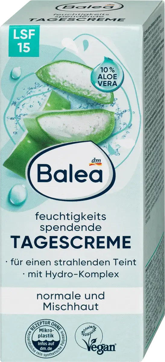 Увлажняющий дневной крем от Balea с алоэ вера а гидрокомплекс обеспечивает интенсивное увлажнение и сохраняет кожу мягкой и эластичной. Витамин Е защищает от свободных радикалов. Защита SPF15 + UVA защищает от преждевременного старения кожи, вызванного светом. Рецепт без микропластика и водорастворимых, чисто синтетических полимеров.