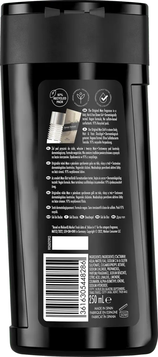 "1. Нанесите небольшое количество геля для душа bruno Banani Man 3-в-1 на руку и вспеньте. 2. Нанесите на тело, волосы и лицо и массируйте. 3. Тщательно примите душ, пока гель для душа не станет мягким. удалить, не оставив следов».