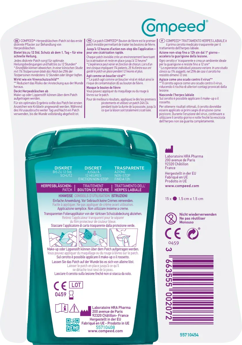 br>Compeed Пластыри от герпеса защищают от грязи и других инфекций снаружи. Благодаря технологии Hydrocure пластырь способствует созданию оптимальной среды для заживления ран. Он защищает лопнувшие волдыри герпеса от загрязнения и дальнейших инфекций извне и помогает предотвратить дальнейшее распространение вируса на вскрывшийся волдырь. Технология Hydrocure с принципом влажного заживления ран обеспечивает оптимальные условия заживления, а срок действия пластыря составляет до 12 часов.