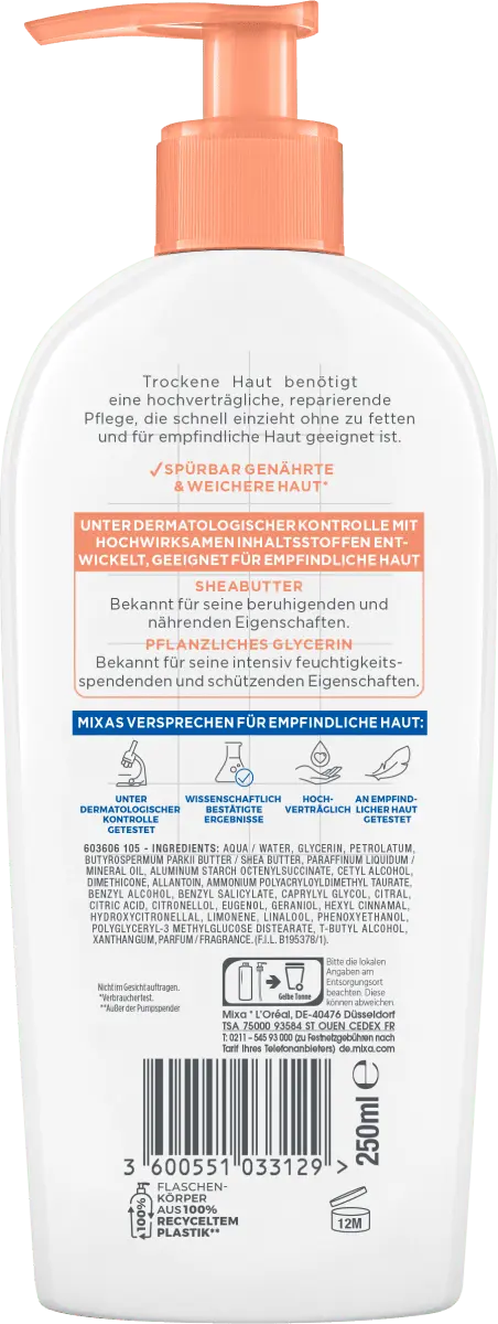 Наносите ежедневное молочко для тела Mixa Shea Ultra Soft. Практичный дозатор-помпа обеспечивает необходимое количество молочка для тела при каждом использовании. Вылейте молочко для тела в руки и немного подогрейте. Затем нанесите на ноги, руки, живот и спину. Нанесите большее количество на особенно грубые или шелушащиеся участки.