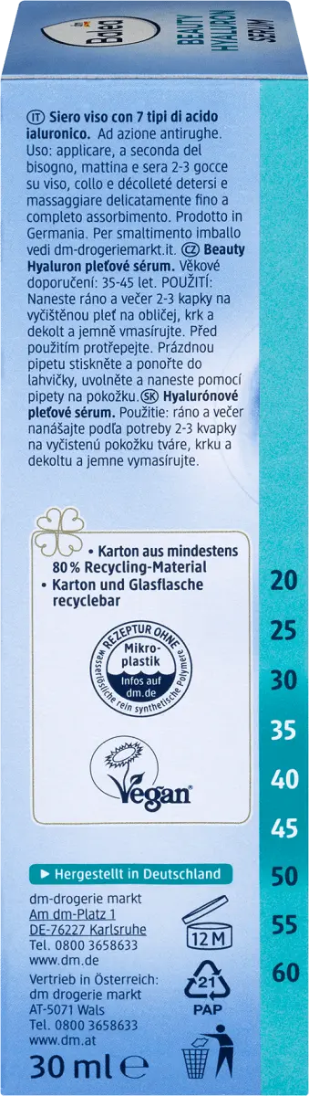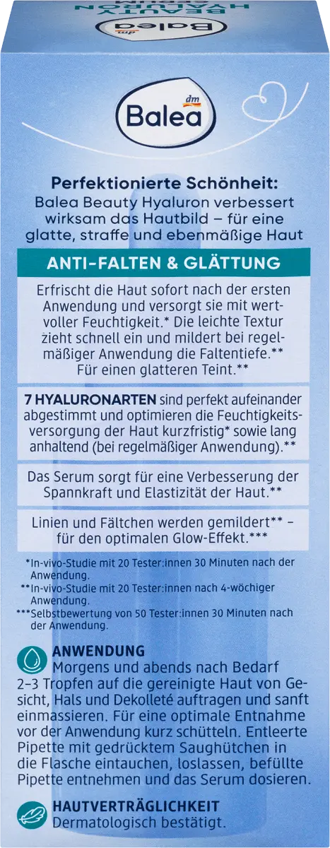 Balea Beauty Hyaluron эффективно улучшает цвет лица – делает кожу гладкой, упругой и ровной. Освежает кожу сразу после первого применения и снабжает ее ценной влагой.* Легкая текстура быстро впитывается и уменьшает глубину морщин при регулярном использовании.** Для более гладкого цвета лица.** 7 ВИДОВ ГИАЛУРОНИКИ прекрасно координируются и оптимизируются. увлажнение кожи. Кратковременное* и длительное (при регулярном использовании).** Сыворотка повышает тонус и эластичность кожи.** Сокращаются линии и морщины** - для эффекта оптимального сияния. *** *Исследование in vivo с участием 20 тестеров через 30 минут после нанесения. **Исследование in vivo с участием 20 тестеров после 4 недель использования. ***Самооценка 50 тестировщиками через 30 минут после использования. Рецепт без микропластика и без водорастворимых, чисто синтетические полимеры.