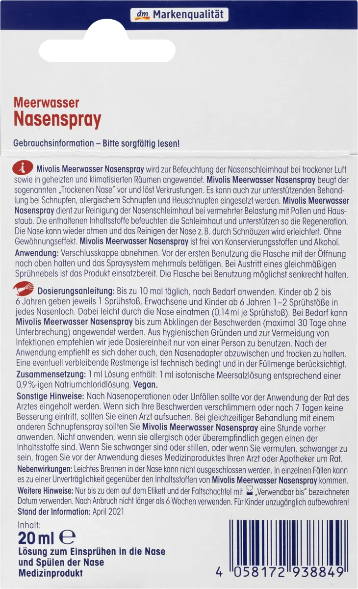 Применение: Снимите колпачок. Перед первым использованием держите флакон отверстием вверх и несколько раз активируйте распылительную систему. Когда появится равномерный распыляемый туман, продукт готов к использованию. При использовании бутылки держите ее как можно более вертикально. Инструкции по дозировке: При необходимости используйте до 10 раз в день. Детям от 2 до 6 лет дают по 1 впрыскиванию, взрослым и детям от 6 лет по 1 – 2 впрыскивания в каждую ноздрю. Аккуратно вдохните через нос (0,14 мл на распыление). При необходимости можно использовать назальный спрей Миволис с морской водой до исчезновения симптомов (максимум 30 дней без перерыва). Из соображений гигиены и во избежание инфекций мы рекомендуем, чтобы каждую дозирующую единицу использовал только один человек. Поэтому после использования рекомендуется протирать носовой адаптер и держать его сухим. Любое оставшееся количество обусловлено техническими причинами и учитывается при заполнении.