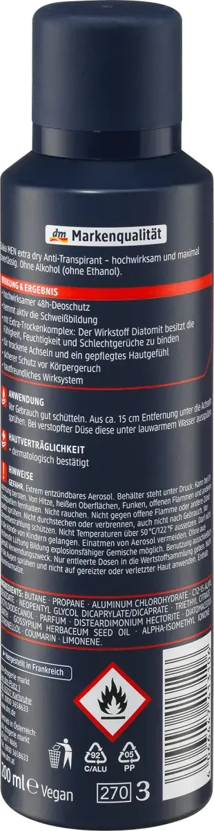 Дезодорант-спрей-антиперспирант Extra Dry от Balea MEN обеспечивает высокоэффективную дезодорантную защиту, которая сохраняется до 48 часов. Специальный активный ингредиент диатомит обладает способностью связывать влагу и запахи пота. Кроме того, комплекс Extra Dry обеспечивает сухость подмышек и ощущение ухоженной кожи. Это активно подавляет образование пота. Рецептура без микропластика и водорастворимых, чисто синтетических полимеров.