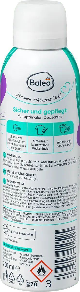 Дезодорант-спрей-антиперспирант Balea 5в1 Защита обеспечивает безопасность и ощущение всестороннего ухоженного состояния кожи под мышками. Спрей не оставляет на одежде белых следов и желтых пятен. Эффективная защита сохраняется до 48 часов. Это делает дезодорант идеальным спутником на весь день.