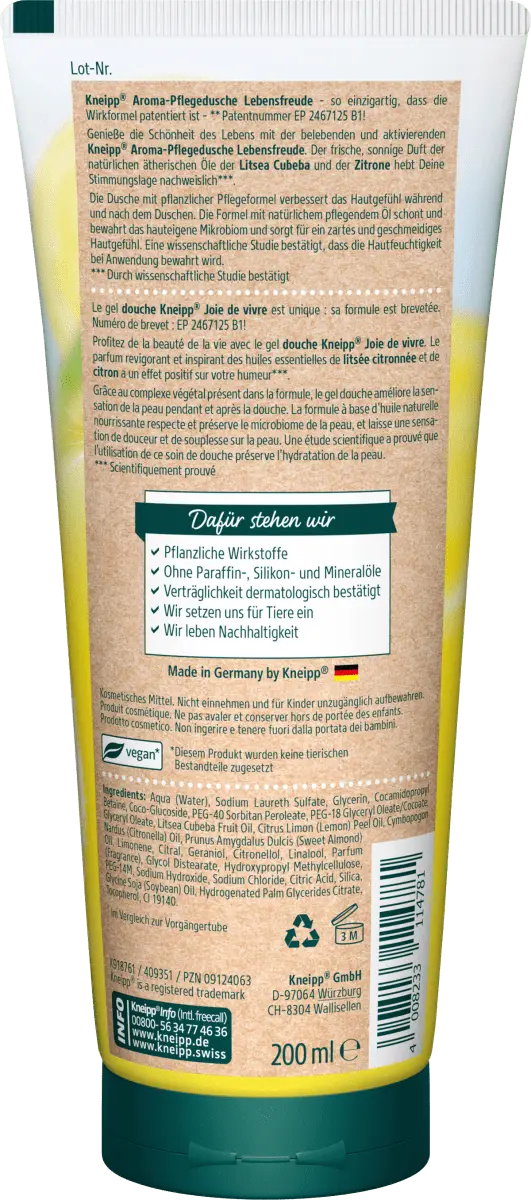 Душ Kneipp Joie de vivre защищает кожу от пересыхания, а свежий солнечный аромат поднимает настроение. Это обеспечивается, в том числе, натуральными эфирными маслами Литсеи Кубебы и лимона. Без парафина и минеральных масел и без щелочных мыл.