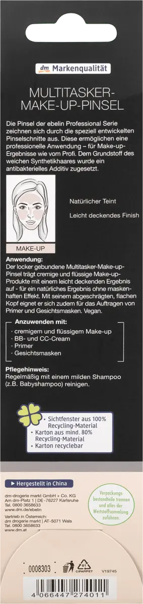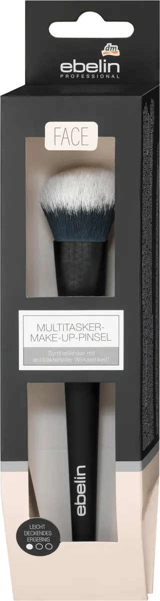 Свободно завязанная многозадачная кисть для макияжа ebelin наносит кремовые и жидкие средства для макияжа с легким покрытием – маски – для естественного результата без эффекта маски. Благодаря скошенной плоской головке он также идеально подходит для нанесения праймеров и масок. Кисти серии ebelin Professional характеризуются специально разработанной формой кисточки. Они позволяют профессиональное применение – для профессионального результата макияжа. В основу мягкого синтетического волоса добавлена ​​антибактериальная добавка.