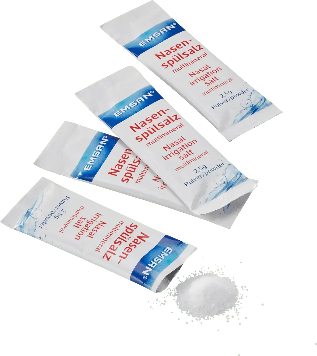 br>1 назальный спринцеватель Эмсан, может использоваться несколько раз одним человеком, 10 пакетиков мультиминеральной соли для промывания носа Эмсан, по 2,5 г каждый на 2500 мл раствора для промывания носа.