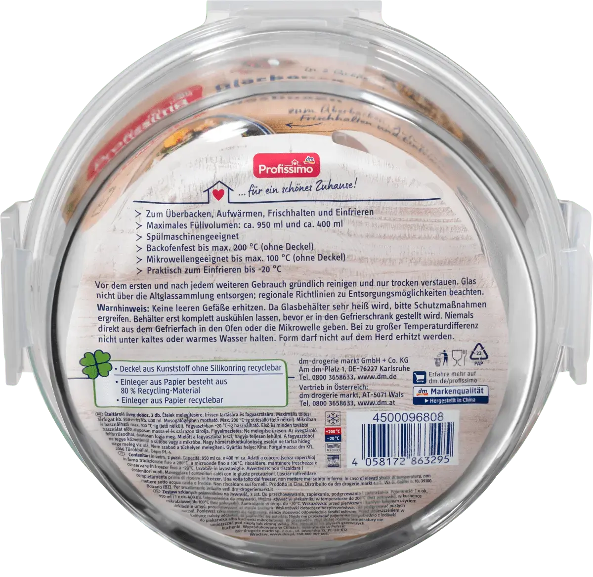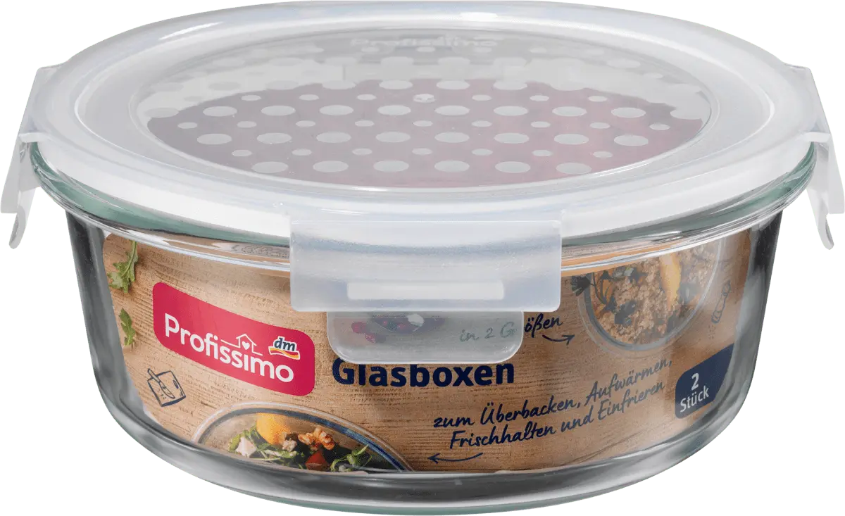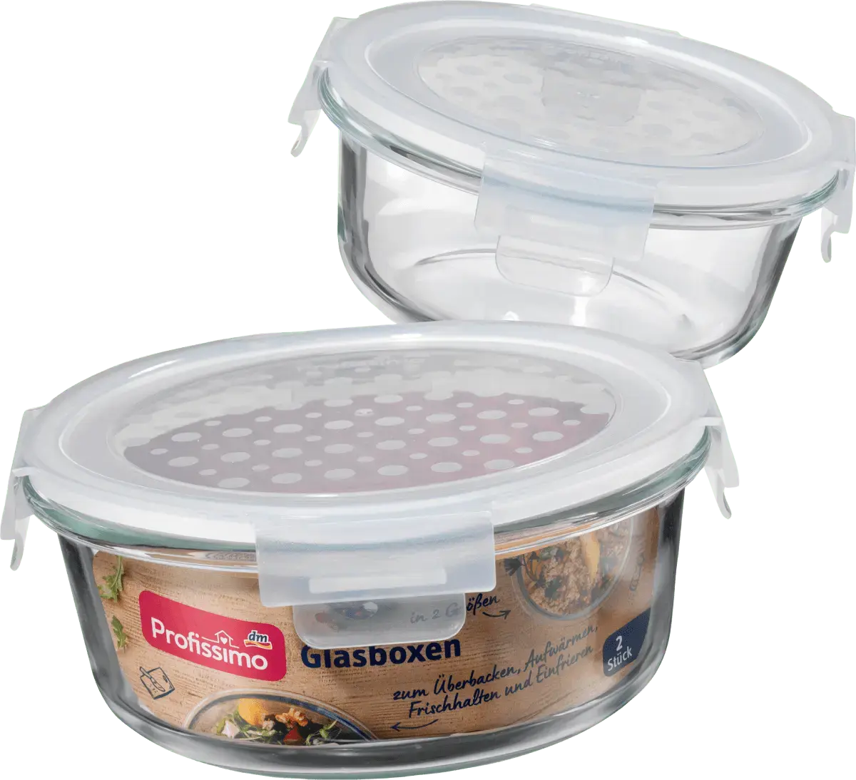 br>Круглые стеклянные ящики Profissimo станут идеальным дополнением к любому дому. Коробки универсальны и подходят для запекания, разогрева, сохранения свежести и заморозки. Объем наполнения около 950 мл и около 400 мл оставляет достаточно места для широкого спектра посуды, а коробки можно легко мыть в посудомоечной машине.
