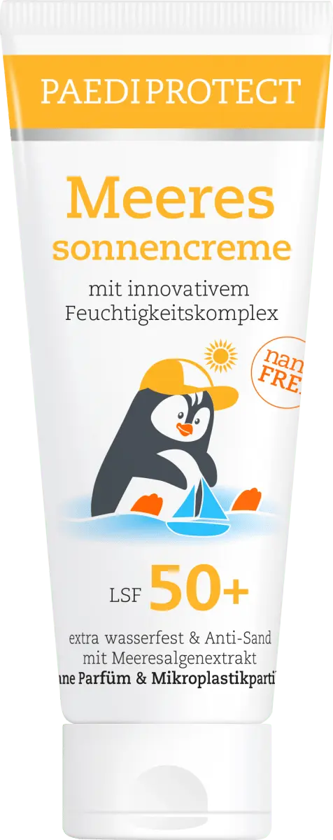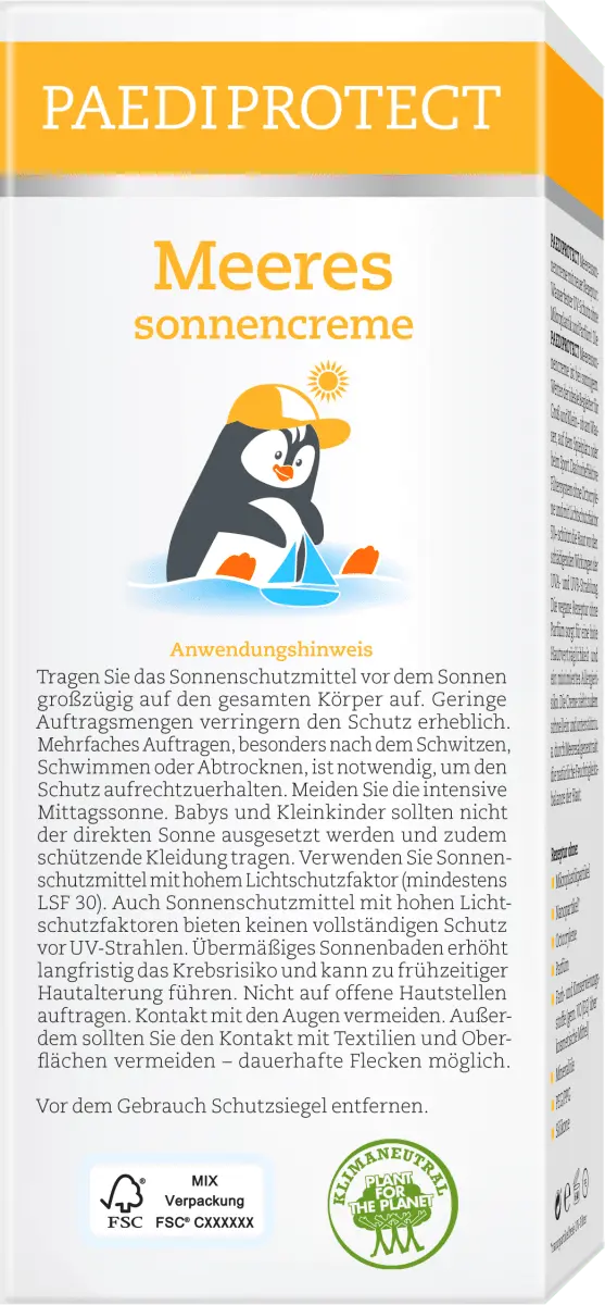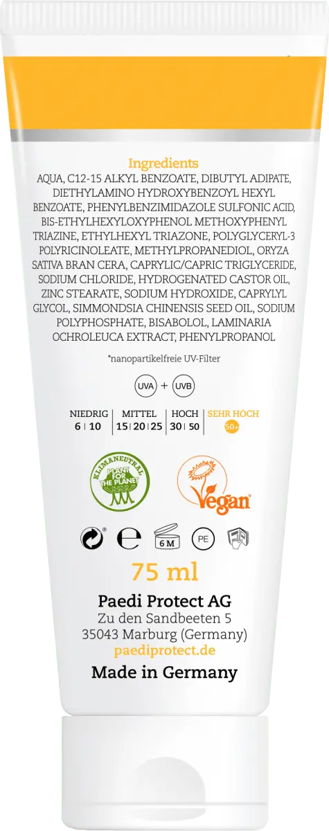 Морской солнцезащитный крем PAEDIPROTECT SPF 50+ обеспечивает водонепроницаемую защиту от ультрафиолета без микропластика и отдушек! Будь то на воде, на детской площадке или во время занятий спортом – морской солнцезащитный крем станет идеальным спутником для детей и взрослых в солнечную погоду. Высокоэффективная система фильтров без октокрилена с солнцезащитным фактором 50+ защищает кожу от повреждающего воздействия UVA и UVB-излучения. Веганская формула также быстро впитывается, обеспечивает высокую переносимость кожей и минимизирует риск аллергии.