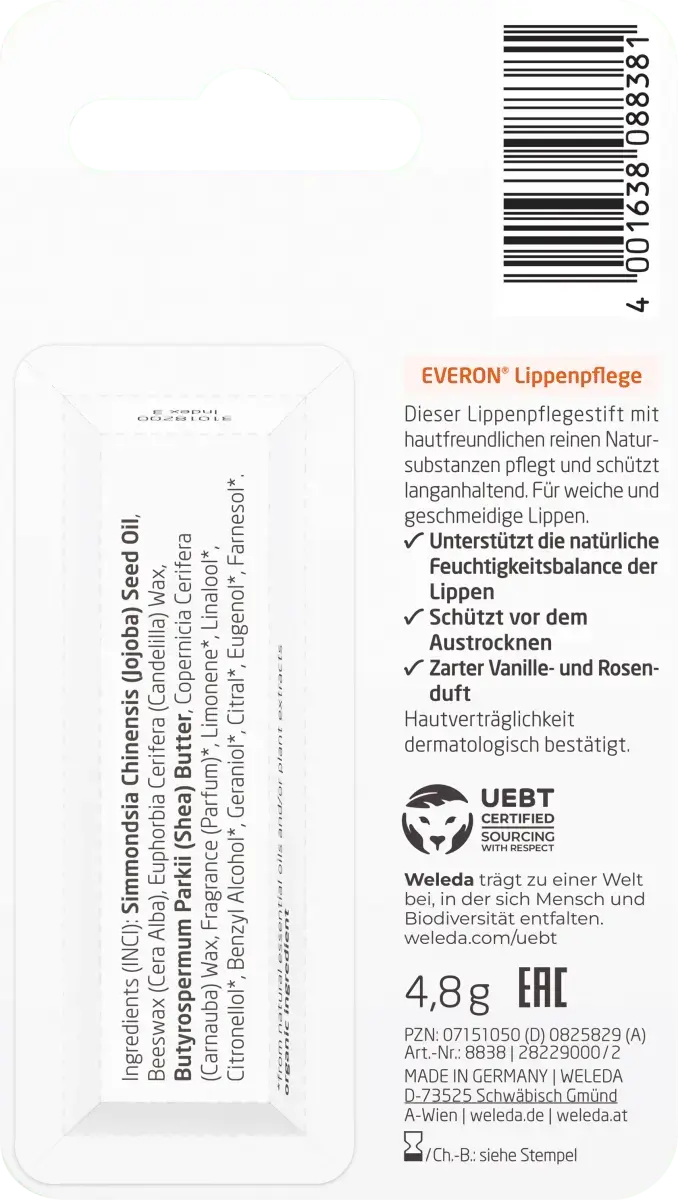 Уход за губами Everon от Weleda специально разработан для чувствительных губ, подвергающихся воздействию холода, ветра и солнечных лучей. Стик для ухода содержит масло ши и канделильский воск, которые защищают от воздействия окружающей среды и предотвращают потрескание губ. Уход за губами не оставляет пленки на коже, а придает ей бархатисто-мягкий блеск. Его можно наносить несколько раз в день, а также он подходит в качестве основы под цветную помаду. Стик для ухода за губами Weleda с растительным воском поддерживает естественный баланс влаги в коже и имеет нежный аромат ванили и розы.