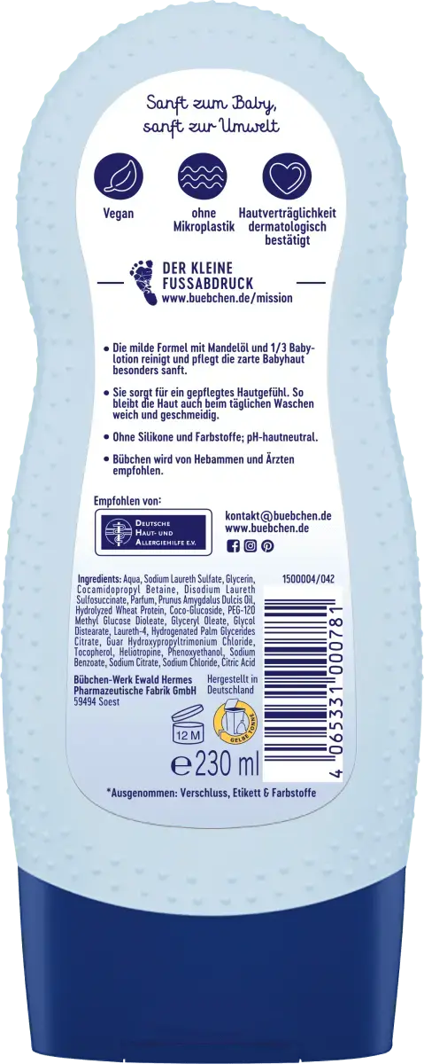 Крем для умывания и душа Classic от Bübchen специально создан для нежной детской кожи и идеально подходит для повседневного использования. Благодаря мягкой формуле с питательным миндальным маслом и третью детского лосьона крем для душа очищает нежно и бережно. Крем также обеспечивает ценную влагу и защищает кожу ребенка от высыхания. Природная защитная кислотная мантия также сохраняется. Крем для умывания гарантирует, что кожа останется эластичной даже после ежедневного мытья.
